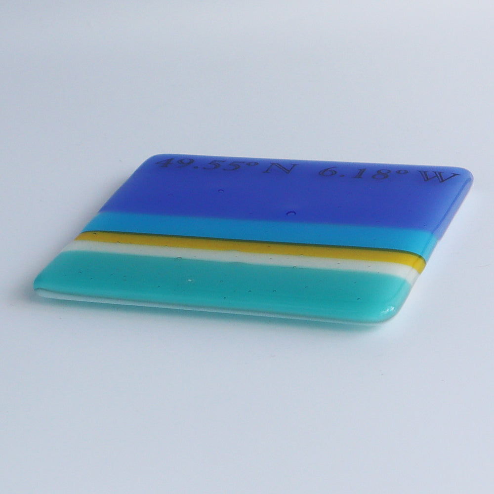 Fused glass coaster handmade in the Isles of Scilly by Oriel Hicks with latitude and longitude degrees of the Isles of Scilly.