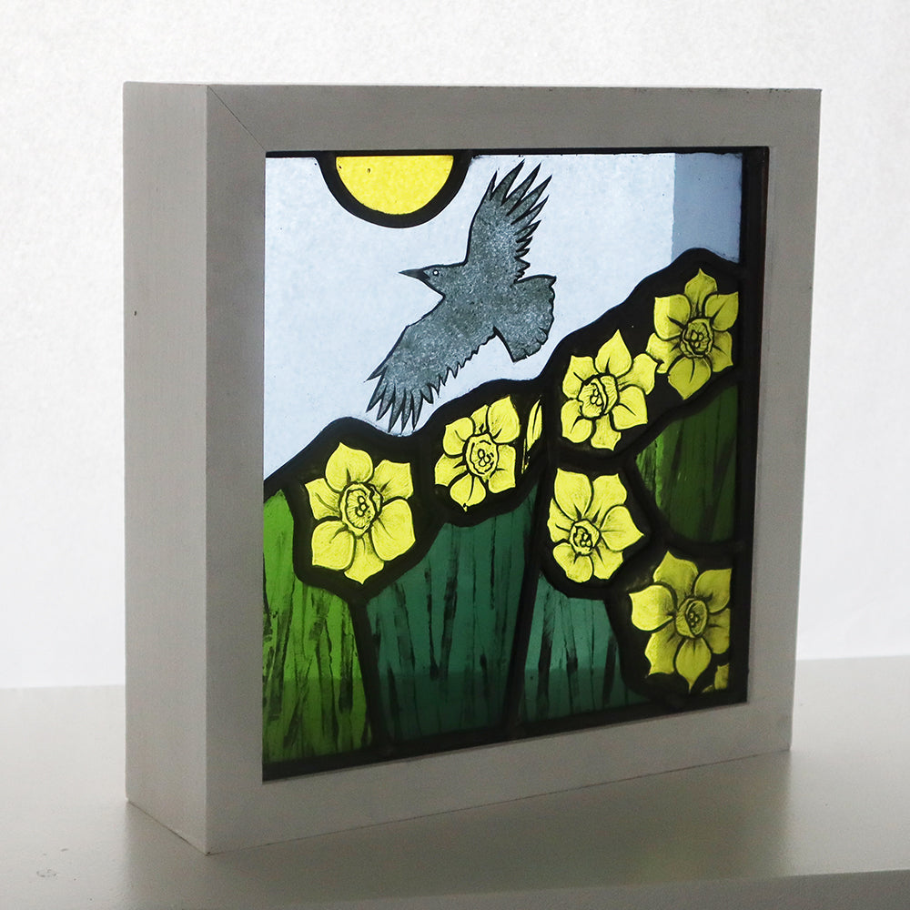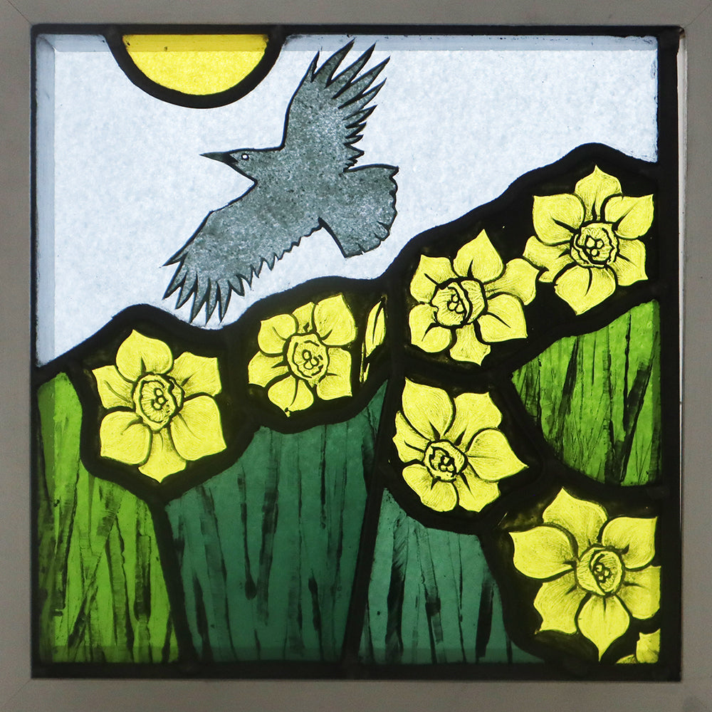 Home › Glass › Narcissi and Crow in Stained Glass, Oriel Hicks