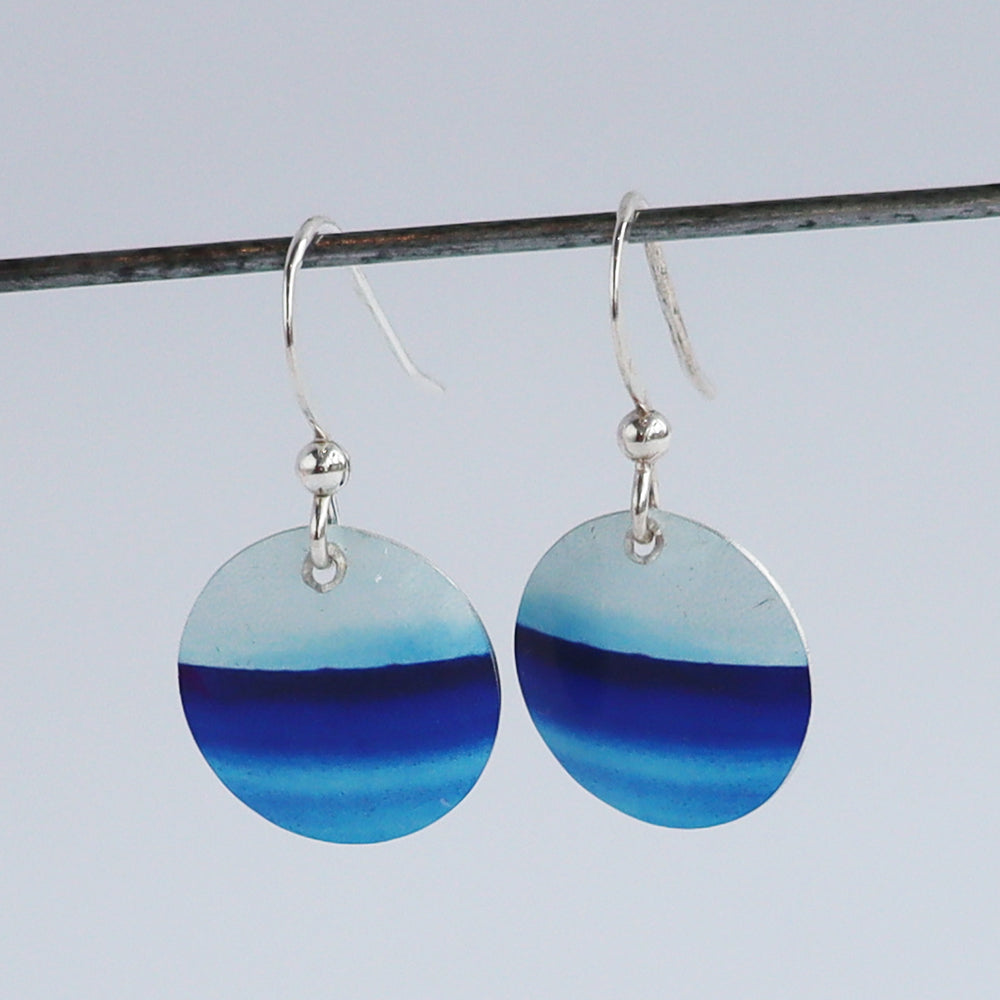 These lightweight earrings are made from anodised aluminium. They are circular in shape and pressed into a dome shape. They feature sterling silver hooks.