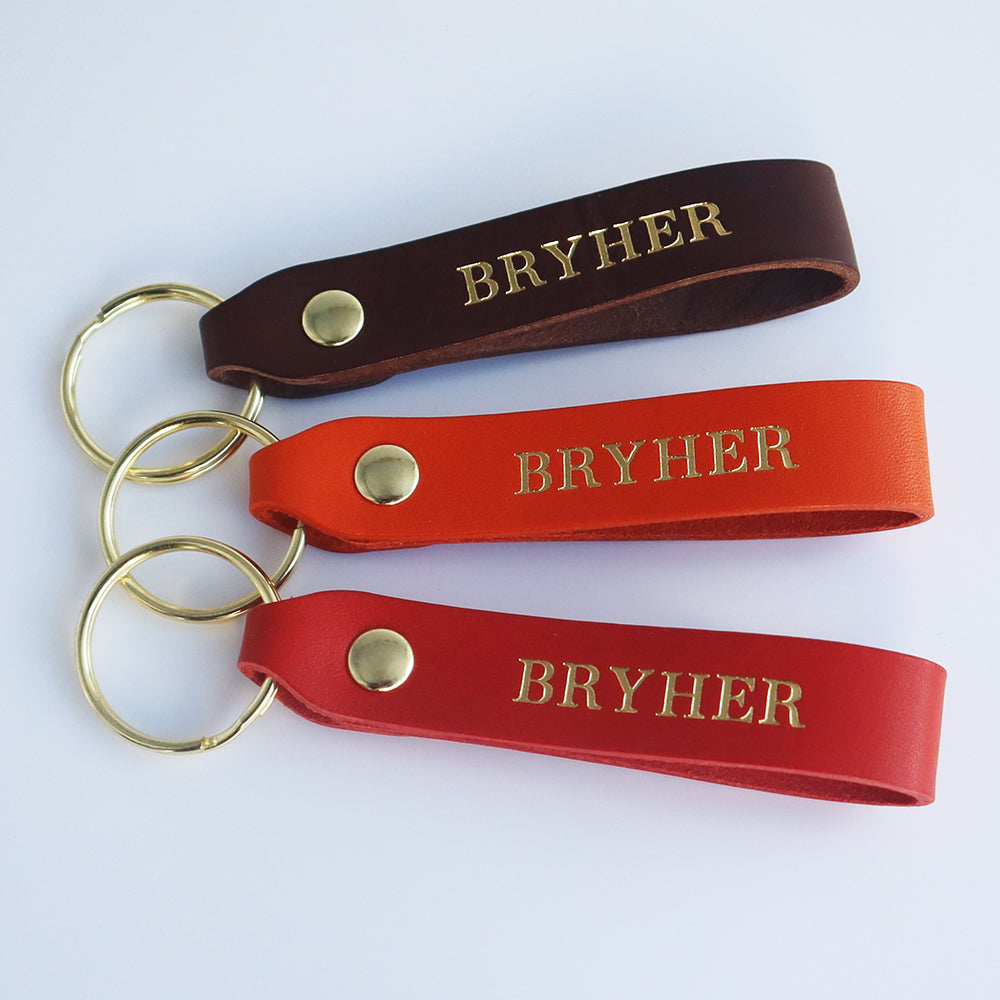 Leather keyring stamped with 'Bryher' and enhanced with gold foil.