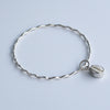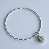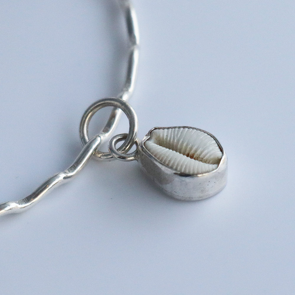 Silver wave bangle with cowrie shell charm, wrapped in silver.