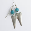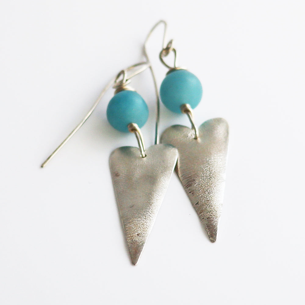 Handcrafted, heart-shaped eco silver earrings with blue quartz beads.