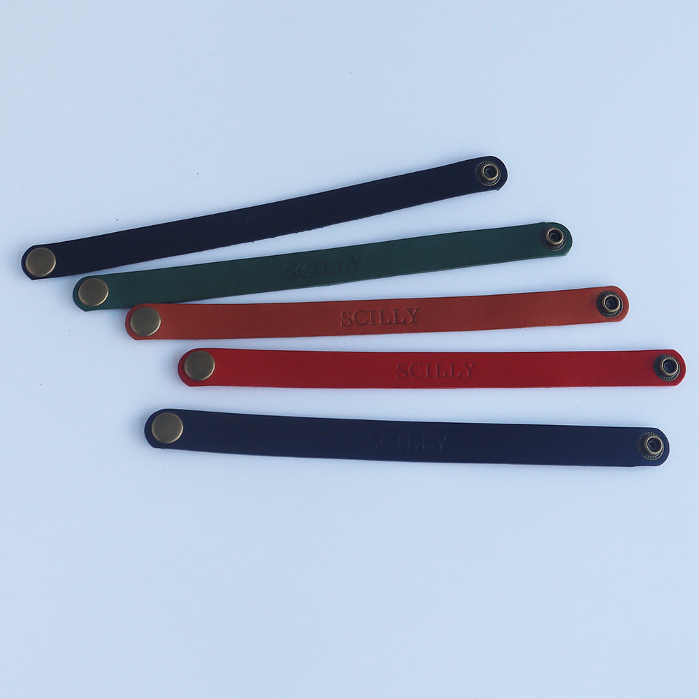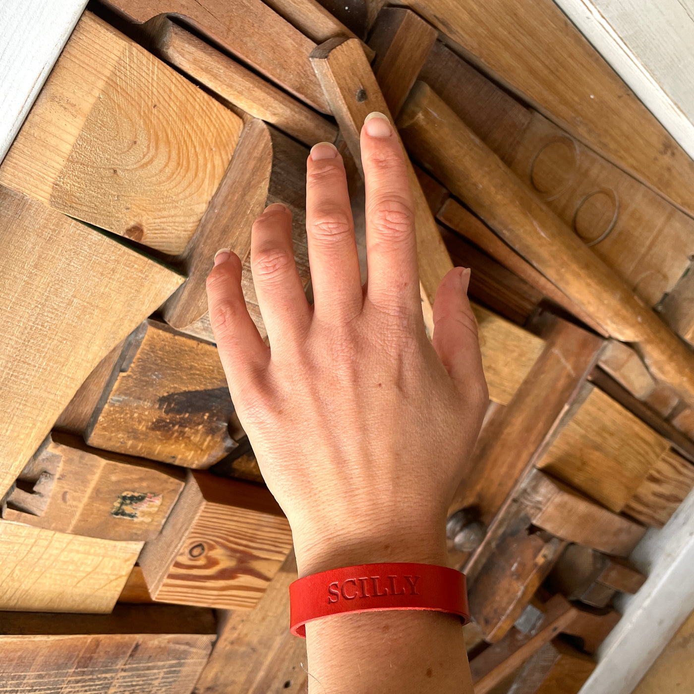 Leather cuff with the words 'Scilly' stamped in the centre,