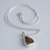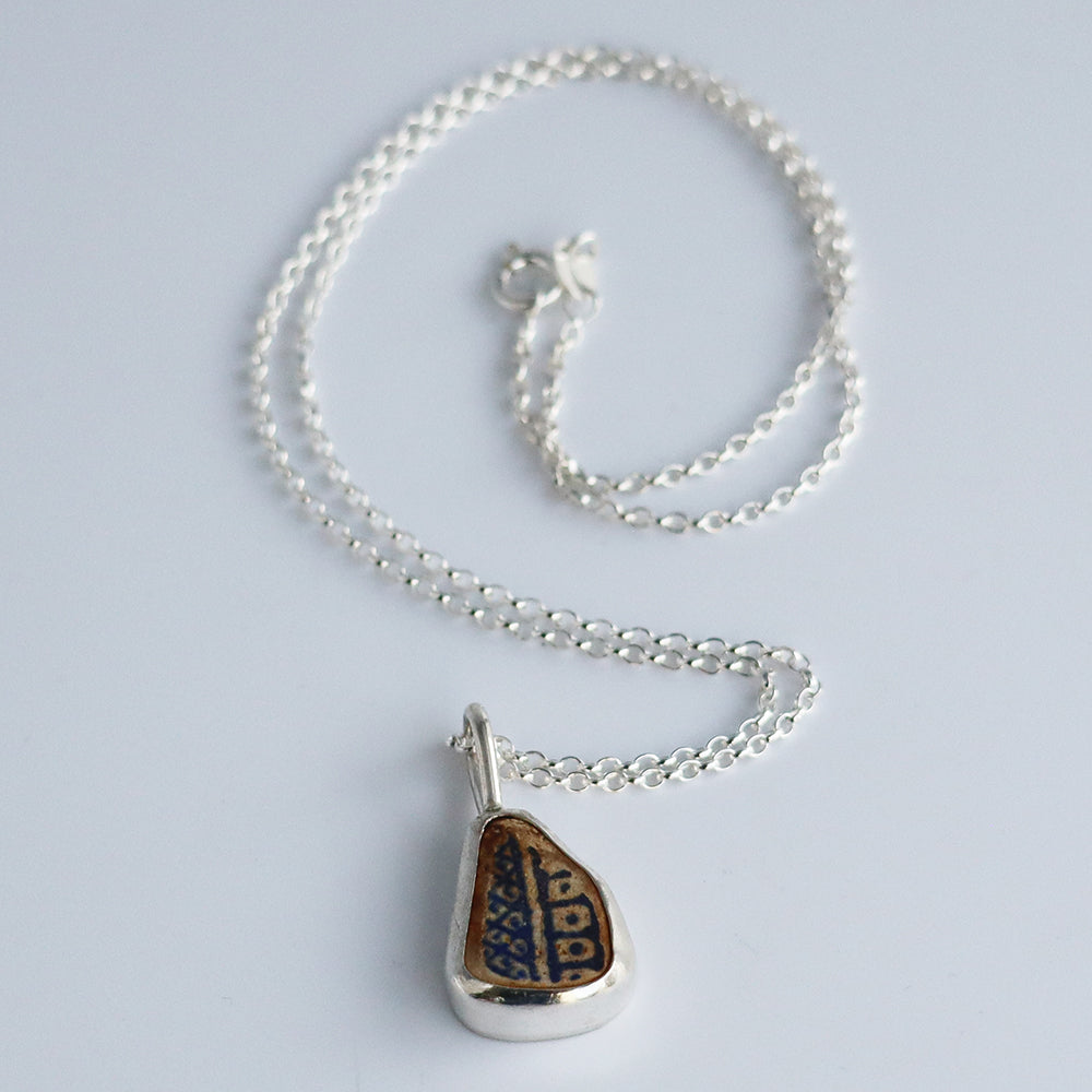 Pottery necklace, wrapped in silver and presented on a silver chain.