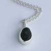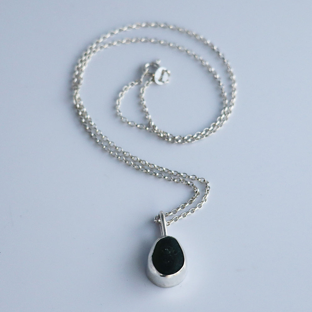 Green sea glass necklace, wrapped in silver and presented on a silver chain.