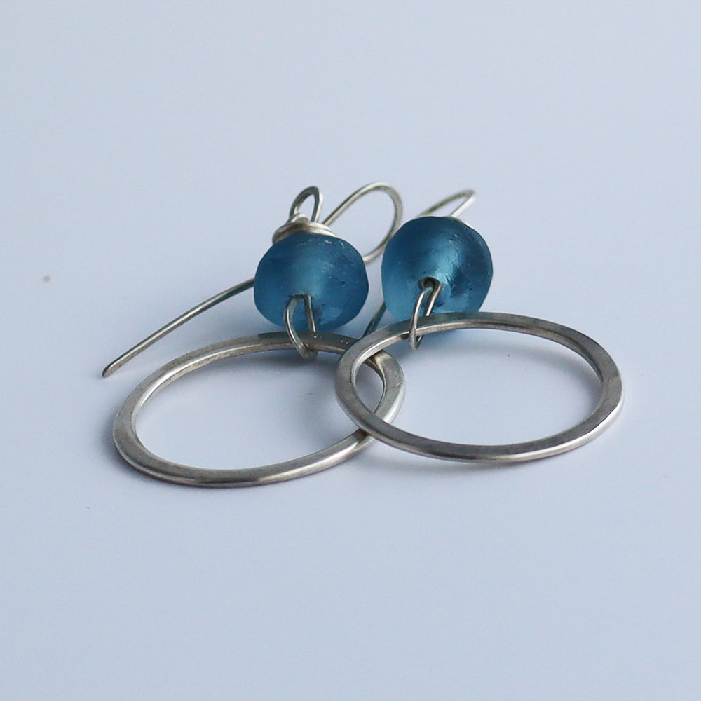 Jen Williams, a jewellery artist based in West Penwith in Cornwall, uses the ever-changing, rugged coastline of the peninsula to inspire her work. She tumbles her recycled glass beads to give them the look and feel of beach glass and lines them with silver so that they reflect the light.